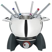 The Trudeau electric fondue pot makes the inconvenience of sterno a distant memory! The 11 piece set is a space saver offering the choice of either hot broth or oil based fondue for meat and seafood or just pop in the stoneware bowl for cheese or chocolate fondue. The mirror finish 18/10 stainless steel pot rests on a modular warming base that has a non-stick warming plate with a variable temperature control. The built in light indicates either on or off. The electric fondue also comes equipped with a quick release, magnetic power cord for safety, 6 stainless steel forks with a bright dot of color on the end for ease of identification and a fork guide to keep forks from sliding. 500 watts and UL approved.