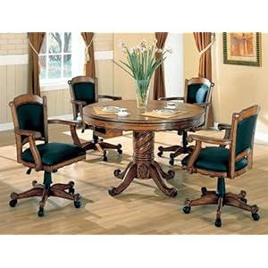 3-in-1 Oak Finished Wood Poker, Pool, Game, Dining Table and 4 Chairs Set. This is a brand new designer 5 pieces "three in one" game table set with 4 matching oak chairs. The game table features 42" of playing surface, and can be transitionally changed between 3 settings: bumper pool table, poker table, or dining table. The pool sticks and balls are included in the set. The price shown is for the game table and 4 matching solid wood chairs. This set is elegantly styled for an enhanced American feel, and it is exactly what every gaming enthusiast needs in their home. The seat is of a Black color with a thick cushion for optimal look and comfort. The construction of all pieces is superb, with quality oak finished wood pieces made to last and be durable for all your dining and family fun needs. Assembly is required. Note: The price is quoted for 5 pieces set of one table and 4 arm chairs. Chairs do not come with gas lift. Specifications - Dimensions: Table: 47-1/2" diameter X 31"H, Chairs: 24"L X 24"W X 37"H.